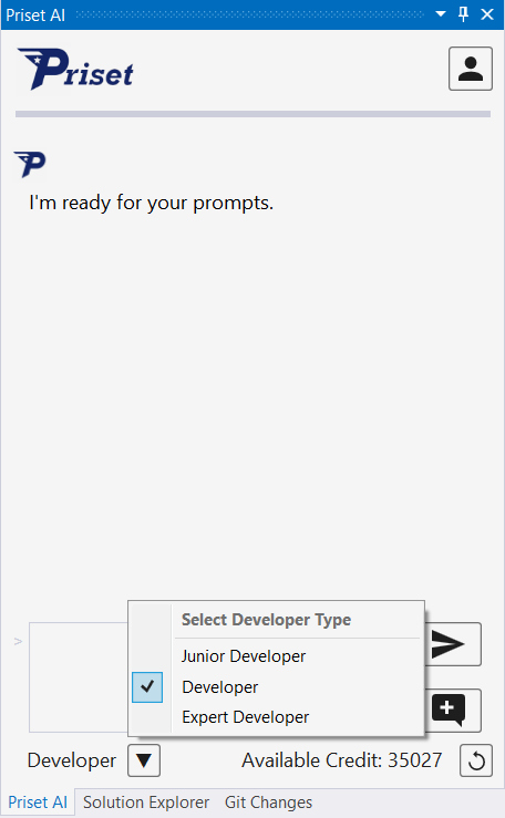 If you are starting afresh and want Priset to build the whole new application for you, we recommend using Expert Developer to build the application skeleton. Then you can start experimenting using Developer or Junior Developer for simpler tasks.
