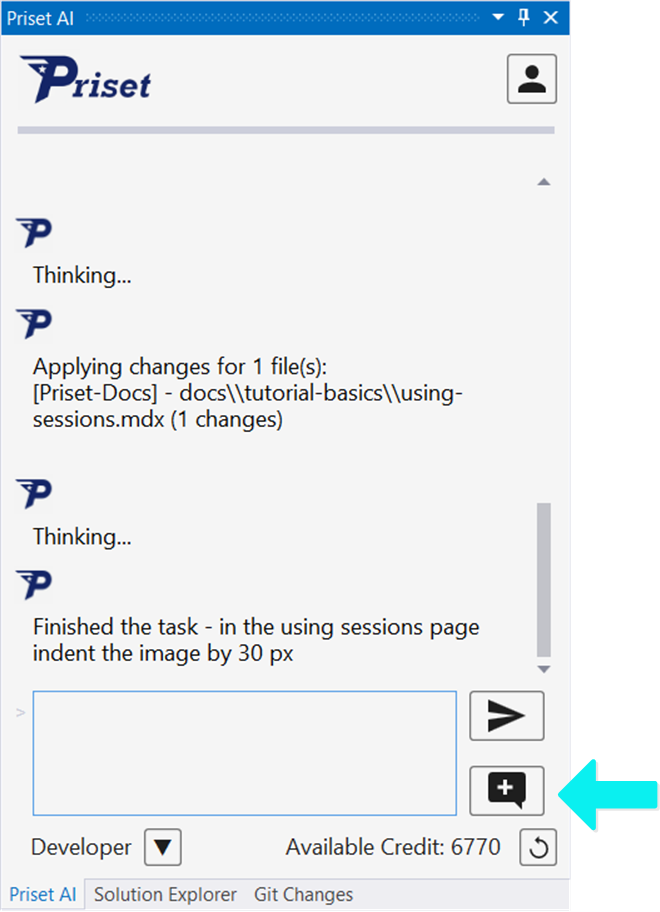 Be aware that as your session grows bigger and collects more information that will increase your prompt and consequently would take more credits. Therefore, after you finish the task and all issues are fixed, check in the changes and start a new session for new tasks.